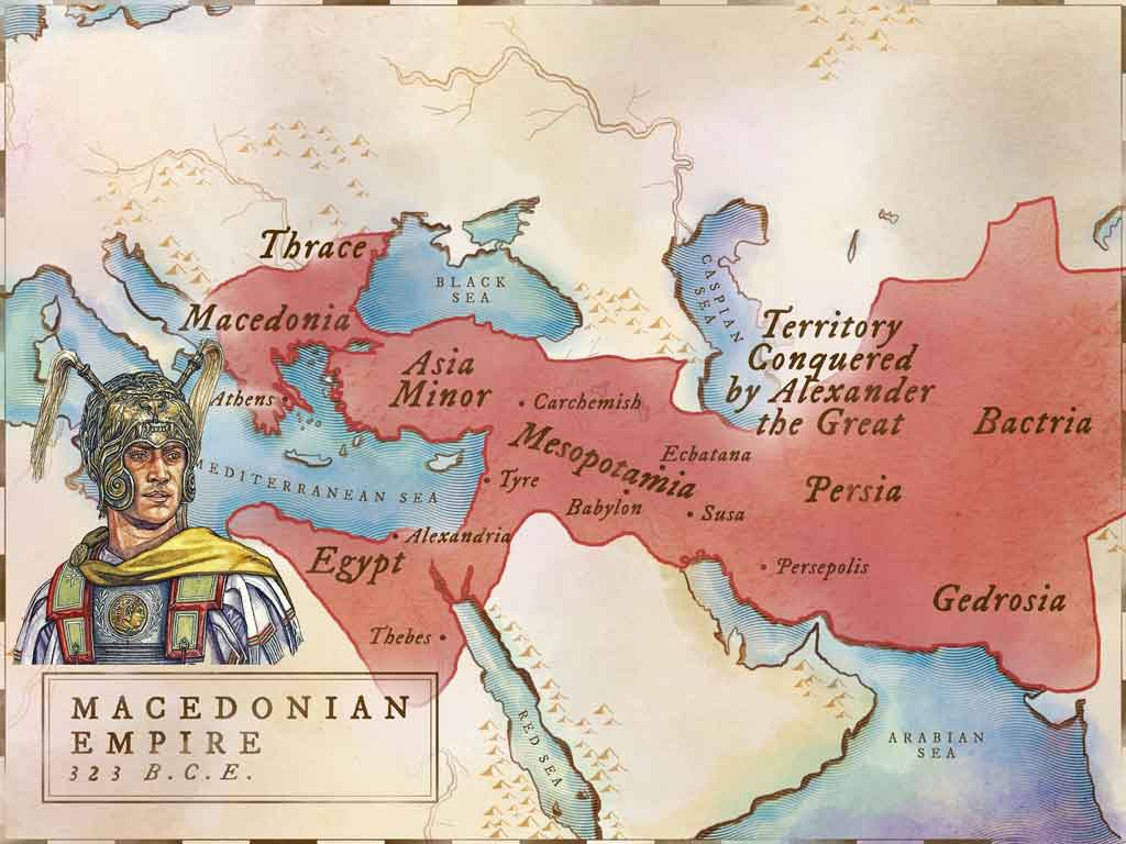 Bei der Teilung des Alexanderreiches in Babylon im Jahr 323 v. Chr. teilten die obersten Köpfe der makedonischen Armee das Reich in Abschnitte auf (siehe folgende Karte unten), wobei Makedonien, das eroberte Griechenland und Südosteuropa einen Teil ausmachten. Kleinasien (heutige Türkei) einen anderen und Nordafrika einen dritten Teil des Reiches. Die von den Makedonen eroberten Gebiete West- und Zentralasiens gingen allerdings an andere Herrscher.