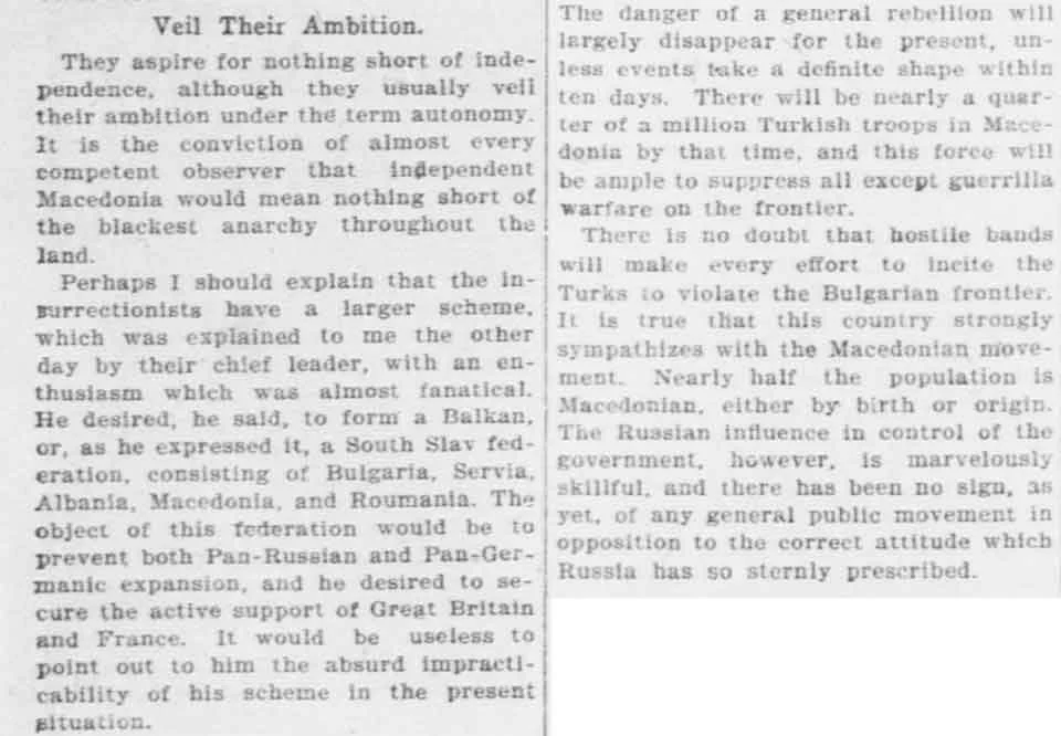"Sie streben nichts weniger als Unabhängigkeit an, obwohl sie ihren Ehrgeiz mit dem Begriff Autonomie vertuschen. Experten sind überzeugt, dass ein unabhängiges Mazedonien die schwärzeste Anarchie des Landes bedeuten würde. Vielleicht sollte ich erklären, dass die Aufständischen ein größeres Ziel haben, wie mir neulich mit fast fanatischer Begeisterung von ihrem obersten Führer erklärt wurde. Er will einen Balkan oder, wie er sagt, eine südslawische Föderation, bestehend aus Bulgarien, Serbien, Albanien, Mazedonien und Rumänien. Das Ziel dieser Föderation wäre es, die panrussische und pandeutsche Expansion zu verhindern, und er möchte dies von Großbritannien und Frankreich aus aktiv unterstützt werde. Es wäre sinnlos, ihm die absurde Unmöglichkeit dieses Ziels in der gegenwärtigen Situation zu erklären", schrieb der Korrespondent der Washington Times.